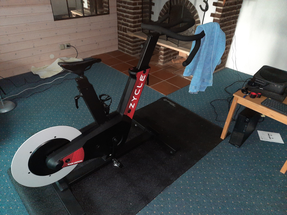 -> I knew there was no freewheel. Yet the lack of that was somewhat uncomfortable. You cannot pick up e.g. a bottle from the floor without receiving punches from the pedals. So I had to put a high table next to the bike to be able to reach things I may need during the ride (keyboard, watch, bottle, phone,..).